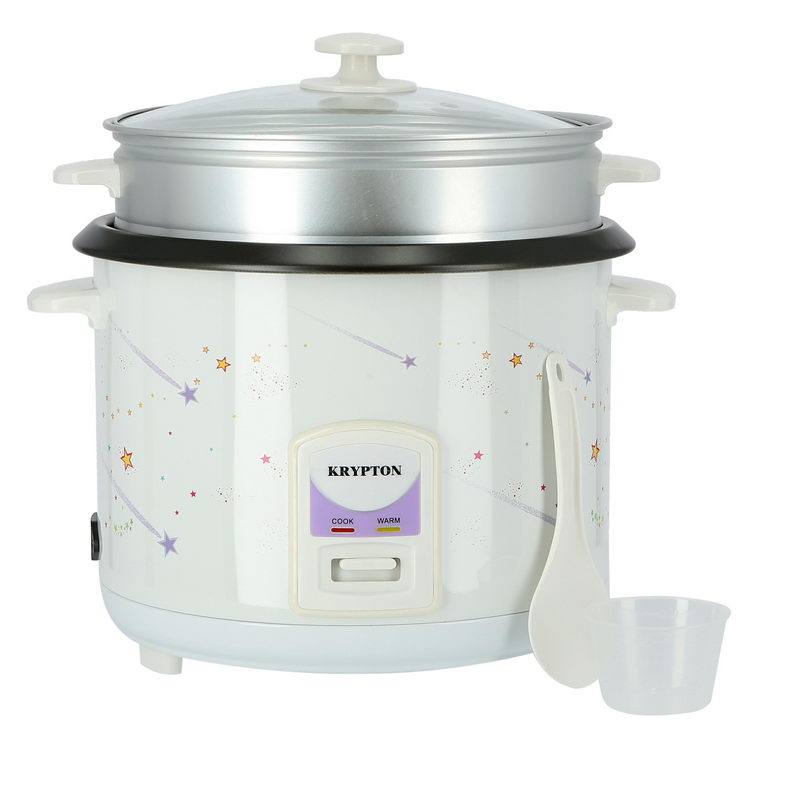 Krypton KNRC6106 2.8L Rice Cooker with Steamer - Rice Cooker and Steamer is an easy way to cook rice. With a 2.8L capacity bowl, enough space to cook up to 18 cups of rice, it is useful for larger households who love to cook. The keep warm function allows you to keep your rice warm, ideal for those busy families who find it hard to all sit down together. The Rice Cooker and Steamer includes a spatula and measuring cup along with an additional tray for steaming fish or vegetables making the piece very versatile. The stainless steel base design is easy to clean and the glass lid allows you to view your food whilst cooking and its non-stick removable bowl enables easy cleaning and easy of use.The main features of Krypton KNRC6106 are3-IN-1 MULTIPLE FEATURES Cook: With the push of a button, the device starts working and automatically adjusts temperature. Steam: The steam function lets you cook rice healthily while preserving the nutrients. Warm: It can also warm the rice back to their fresh hot state. DURABLE AND TOUGHER OUTER BODY The cooker has an elegant design and a durable body. It has non-slip feet at its base, they keep the pot firmly in place. It has a compact and cute design. It covers less space and does not clutter your kitchen counter. 2.8L LARGE CAPACITY ACCESSORIES This pot has a large capacity of 2.8L. Now you can make large servings for the whole family or deal with sudden guests. It is quick and efficient. The package includes a measuring cup and spoon. The measurement cup adds preciseness to your cooking, and with the rice spoon, you can take rice out with ease.