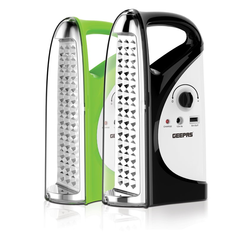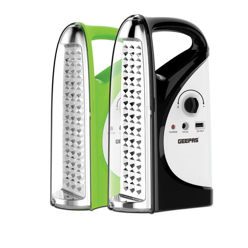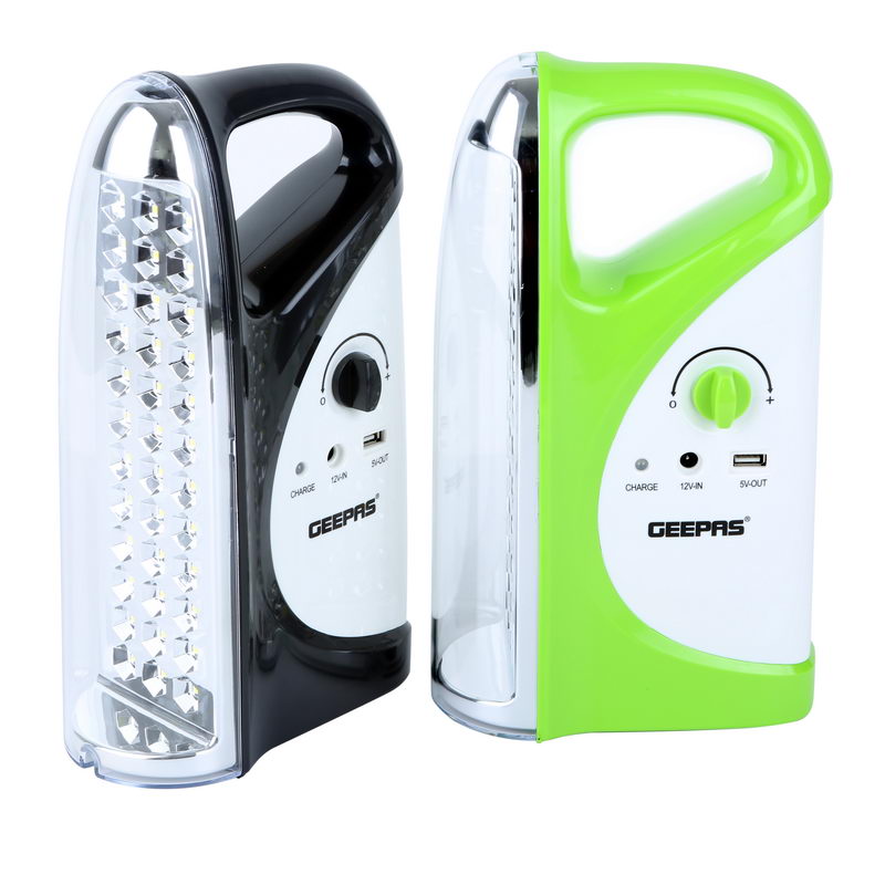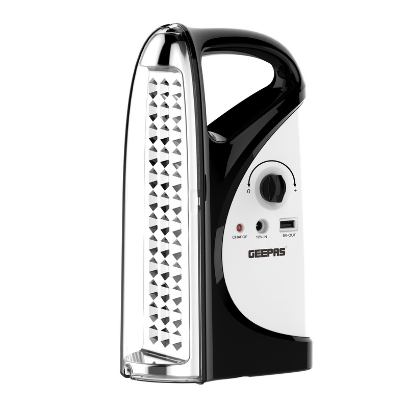 1. GEEPAS RECHARGEABLE EMERGENCY LANTERN - Geepas rechargeable lantern, it is easy to carry as it has a compact size and can fit your travel bag with ease. With its brighter light and long-time performance, it is ideal for camping as well as sudden power outages. This lamp uses 36 Pcs Mega Luminous LEDs and requires 20 to 24 hours to charge completely.2. 36PCS HI-POWER LONG-LIFE SUPER BRIGHT LEDS - It is a more efficient way of providing brighter light in smaller size with 36-pcs 0.5W Hi-power LEDs in lantern. It can easily light up a room without power supply.3. HIGH AND LOW BEAM LIGHTS OPTION - This Geepas rechargeable lantern has a dual setting option which provides an option to use low power for 200 hours continuously. And it lasts for 7 hours at high power.4. OVER CHARGE & OVER DISCHARGE PROTECTION - This lantern and torch has built in features if in case you have left your torch on charging will avoid overheating and in the mean while with over discharging of power too.5. SOLAR & USB INPUTS -This lantern is easy to carry while travelling as it can be charged multiple ways like with adaptor, USB cable with laptop, power bank or you can even plug the the solar input. So no need to worry about power.6. ENERGY EFFICIENT, INDICATOR LIGHTS - It consumes very less energy without compromising with working hours and its 18W Led's brightness. The indicator lights are very helpful while charging, it will reflect red light while getting charged and once it is fully charged it changes to green light.