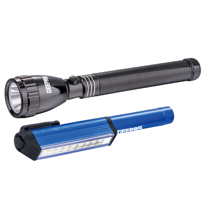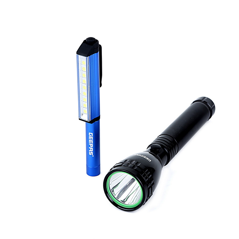 1. HIGH-INTENSITY LIGHT WITH LED FLASHLIGHT - This Geepas 2 In 1 Led Flashlight has a high-intensity light with a led flashlight that gives bright white light which is less harsh and gives you clear visibility at night. This torch is very much useful in emergency light in case of power failures at your home.2. RECHARGE UPTO 1500 TIMES & 1500 METERS REAL RANGE DISTANCE - This torch has an immense wavelength and is capable to reach a long distance with a maximum range of 1500 meters. Comes with a highly durable rechargeable battery can be charged up to 1500 times.3. LONG WORKING HOURS AT SINGLE CHARGE - This 2 in 1 Torch will provide you the intensity of light long hours at a single charge & small sleek design which is portable and easy to carry while traveling.4. WATERPROOF - This torch is safe to use in water as it comes with compact sealed water which will not allow water to get inside this torch.