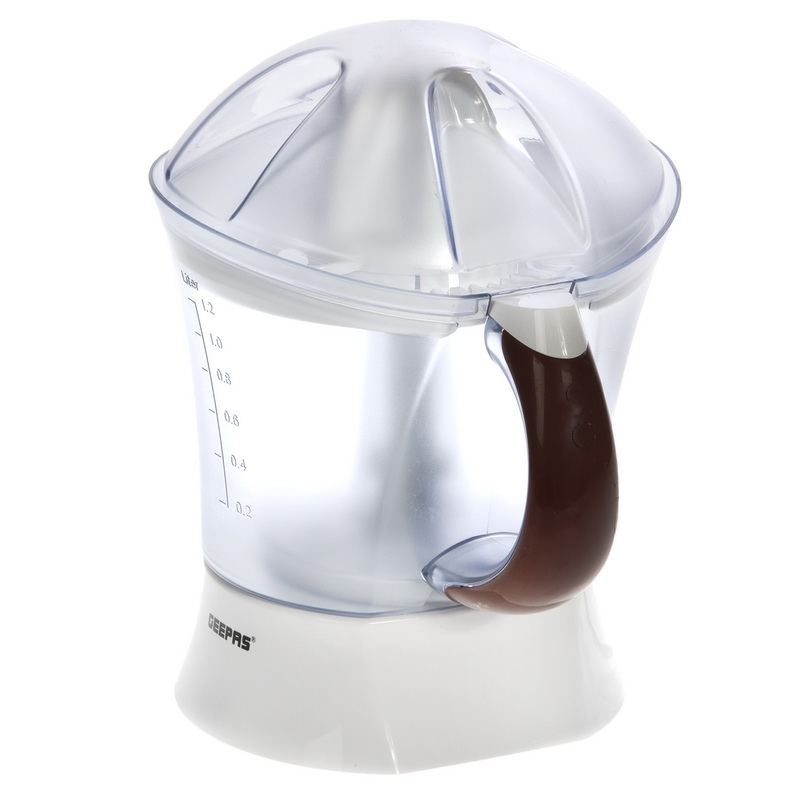 Geepas Electric Citrus Juicer is a simple device that can make your breakfasts more savoring and healthy. As the name describes, this device alone is suited for juicing all citrus fruits.Simple Design, Easy To Use - Instead of fancy gears and blades, this juicer is designed on the basic principles of a hand juicer. It couldn't be any simpler. It is super easy to use.1.2L Large Capacity - The juicer jug has a large capacity of 1.2 liters. You can make juices for more people at once. This also reduces the number of refills, and you can enjoy it with your loved ones.Bi-Direction Twist - The juicer motor allows bi-directional movement. This twisting motion extracts juice more finely up to the last drop. Even large fruits get be juiced efficiently. Now enjoy the freshness and taste to the fullest.2 Press Cones - This item comes with two different sized press cones. On is large and the other is small in size. Both are suited for various citrus fruits. The large fruits like oranges, etc can be juiced on the larger cone and the small ones like lemons on the smaller cone.Comfortable Handle For Easy Handle - The jug handle is shaped for increased comfort in holding, and it is really easy to pour drinks.