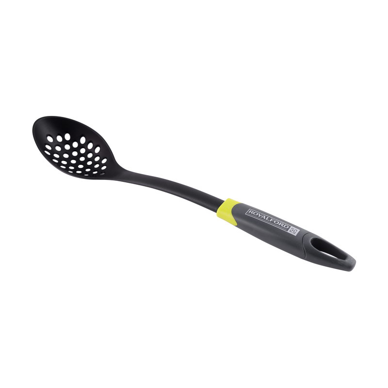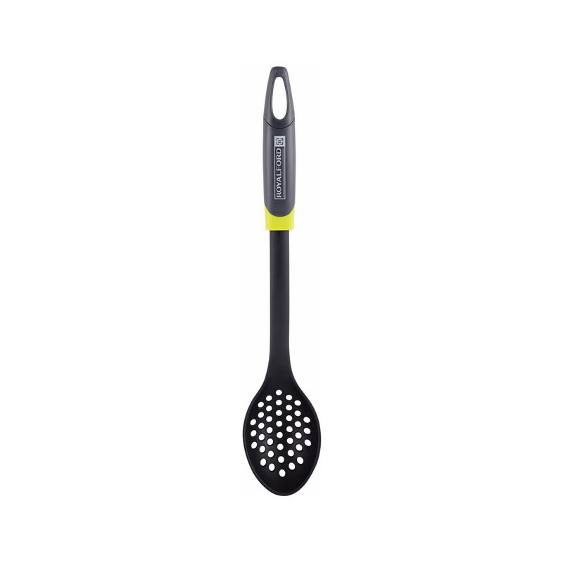 Royalford Slotted Spoon is ideal for hundreds of food lifting & serving tasks - from fried eggs, burgers, lasagne, fish fillets and more. It has long-handled, so you can safely use it in hot pots and pans without having to worry. With this cooking slotted spoon wide head and tapered edge, you can easily lift bulky, fragile foods from frying pans and trays.It's just perfect for lifting fillets of cod, omelettes, beef burgers and fried eggs completely intact. Comfortable to use The slotted spoon boasts an ergonomic ABS handle. This makes straining much more comfortable. And with its soft-touch design, it's really easy to maintain a secure hold as your stir, strain or serve. Ideal for skimming soups and jams, or removing food from hot pans. Safe & Durable Safe for cookware, bakeware and electrics.No nicks, no scuffs and no scratches! Ideal for flipping eggs, burgers, crepes and more. Stain and odour-resistant Thanks to its heavy-duty nylon design, this slotted spoon won't discolour or absorb odours. This makes it ideal when you're cooking with strong or colourful ingredients, such as blackberries and cinnamon.Easy to store away, Extra-Long Design for Control and Safety Its ABS handle features a sleek design. This means you can simply hang it up on a kitchen hook or a utensils rack once you've finished. It has a longer handle than most. This means you can stay a safe distance away from hot pans, grills and ovens, without losing the precise control afforded by the soft-grip handle.